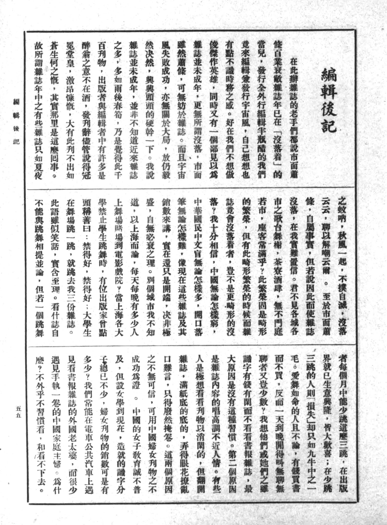 显然,目前这一期还远谈不上“令人满意”。如果要从北京大学确有写作能力来衡量,应该说,这一期是“不满人意”的。这首先是由于我们筹备过程中没有充分发动群众,没有充分动员一切可以动员的写作力量。致使目前的刊物在内容的丰富性、形式的多样性和总的质量的保证上都受到一定的限制。我们计划的许多栏目不能不留作空白;我们没有精悍的短论、犀利的杂文、辛辣的小品、……在诗歌方面我们没有优美生动的叙事诗、尖锐深刻的讽刺诗……在其他文学样式方面更是提不起来。
