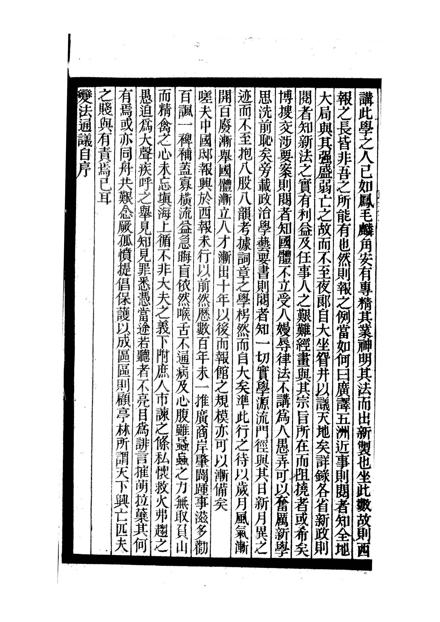 今设报于中国,而欲复西人之大观,其势则不能也。西国议院议定一事,布之于众,令报馆人入院珥笔而录之;中国则讳莫如深,枢府举动,真相不知,无论外人也。西国人数、物产、民业、商册,日有记注,展卷粲然,录副印报,与众共悉;中国则夫家六畜,未有专司,州县亲民,于其所辖民物、产业,末由周知,无论朝廷也。西人格致制造专门之业,官立学校,士立学会,讲求观摩,新法日出,故亟登报章,先睹为快;中国则稍讲此学之人,已如凤毛麟角,安有专精其业,神明其法,而出新制也。坐此数故,则西报之长,皆非吾之所能有也。然则报之例当如何?曰:广译五洲近事,则阅者知全地大局,与其强盛弱亡之故,而不至夜郎自大,坐眢井以议天地矣;详录各省新政,则阅者知新法之实有利益,及任事人之艰难经画,与其宗旨所在,而阻挠者或希矣;博搜交涉要案,则阅者知国体不立,受人嫚辱,律法不讲,为人愚弄,可以奋厉新学,思洗前耻矣;旁载政治、学艺要书,则阅者知一切实学源流门径,与其日新月异之迹,而不致抱八股八韵考据词章之学,枵然而自大矣。准此行之,待以岁月,风气渐开,百废渐举,国体渐立,人才渐出,十年以后,而报馆之规模,亦可以渐备矣。